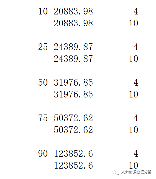 我们用PERCENTILE 函数计算5个分位值,并且每个分位值生成一条薪酬的分位线,这样不管我们选择任意的一个岗位,或者任意的一个部门,薪酬的分位值都是这个岗位的数据。下图是各个分位值的计算数据
