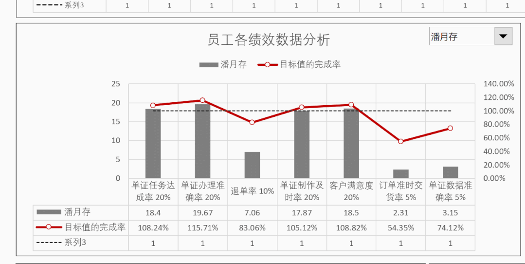 当我选择姓名的时候就会看到每个人的绩效数据分析,绩效达成率等指标,我能看到哪个KPI指标是最低的,从而进行绩效辅导,或者对绩效方案进行设计。