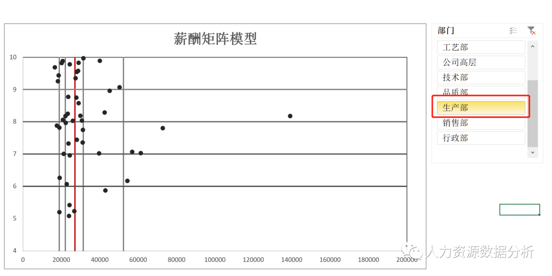 那有了这个模型后,我们如何来解读这个模型呢,首先我们在切片器上选择“生产部”(如下图)在这个模型里我们可以根据每个绩效等级来分析薪酬,在9-10分的绩效区间,我们发现有5个员工的薪酬是在生产部内部的50分位以下的,这个数据明显是有问题,假设在同一个岗位上,绩效分值高,肯定是薪酬数据高,因为薪酬的奖金部分是和绩效挂钩的,所以我们就要看这5个人是谁,这5个人的绩效数据是是什么样的。