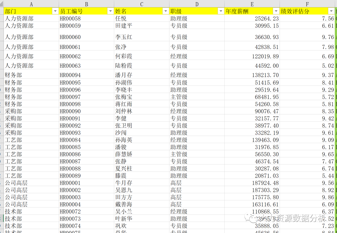 在绩效 - 薪酬矩阵的数据建模上,首先我们有的是原始的各个部门和各个员工的绩效和薪酬数据