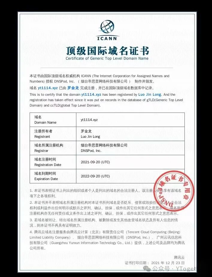 xyz后缀毕竟算不上国际域名,在此期间选择了(YT1114.COM)作为首选域名使用