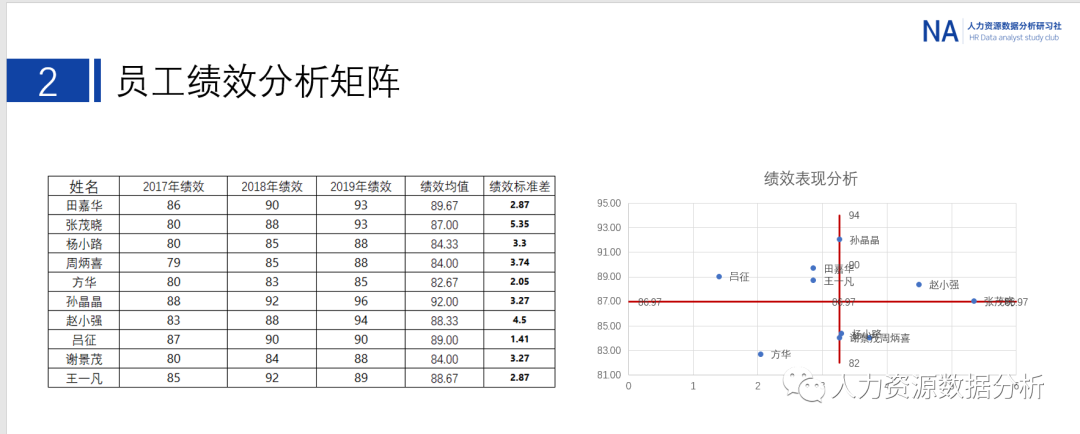 对绩效做数据分析,我们可以分析绩效的稳定性,绩效和能力的数据相关性,找出员工哪些能力和岗位知识,技能的欠缺,从而去提升员工的能力,最终去提升的技能。在这个过程中,你需要有量化的绩效数据,和能力数据,通过人才盘点,九宫格,或者是绩效和能力的相关性模型,用数据说话,来对于业务员的绩效做分析盘点。