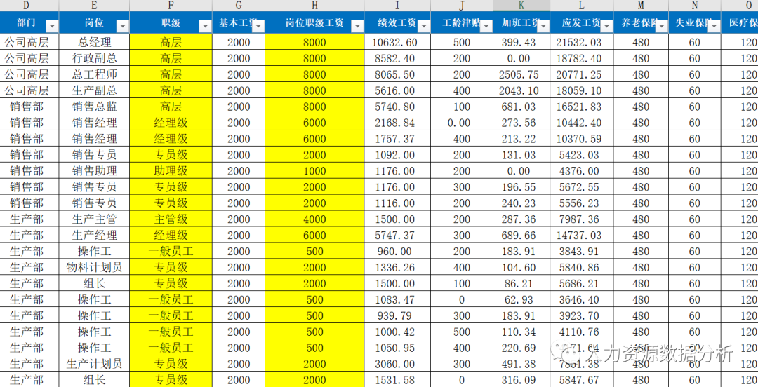 一、 首先建立一个标准薪酬数据分析表,里面包含部门,职级,岗位,还有薪酬各类别的数据,薪酬的数据也是一个标准化的数值的薪酬数据,如下