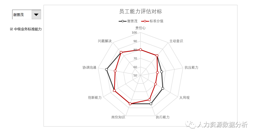 这个模型中有两个数据的筛选选项,一个是员工的选择,我们选择了窗体控件中的组合框模式,另外一个是标准能力的的分值的选择,我们选择了复选框的动态窗格,当我们选中复选框的时候,就会出现标准能力的雷达图分布,这样结合两个交互的动态窗格,就可以来进行数据的交互。
