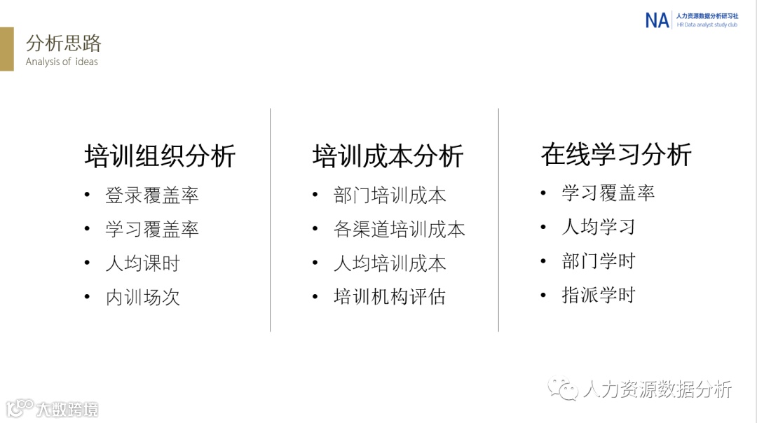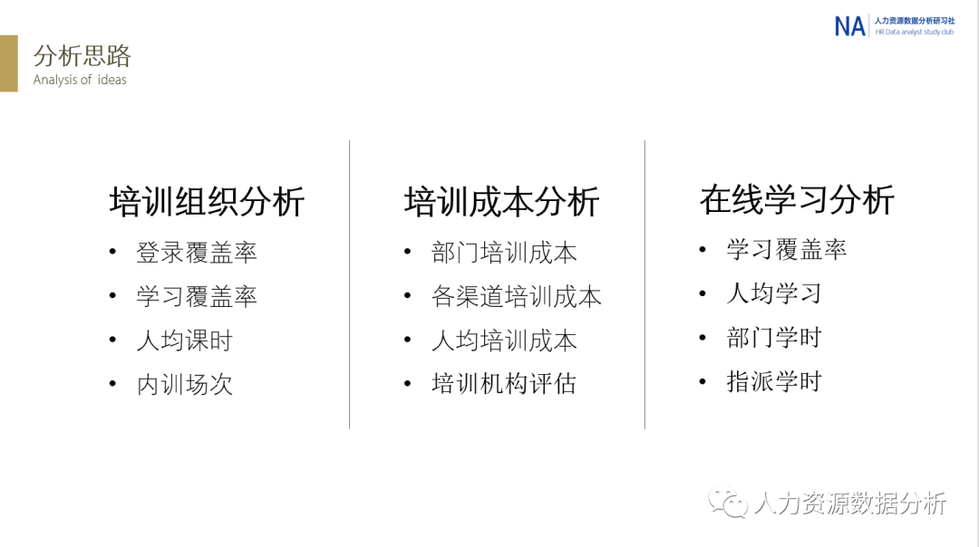 2、分析思路,我如何来做培训模块的数据分析,从哪几个维度切入,我分为了培训组织,培训成本和在线学习分析三个大的维度,同时再细分成若干关键指标。