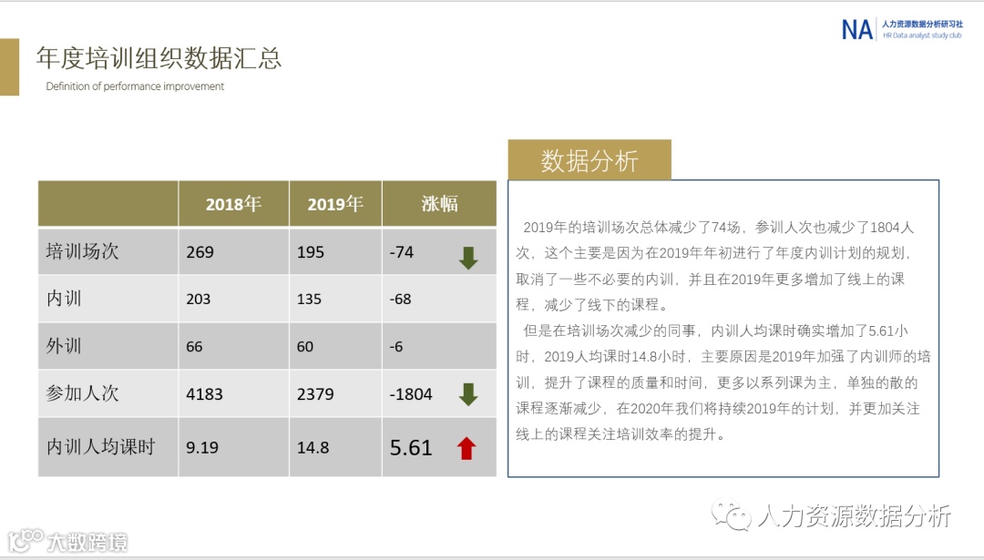 3、在培训组织分析里,我的指标是培训场地和人均课时,同时和去年的数据进行对比,在数据的分析描述上,首先进行数据的描述,然后找出数据的差异值,在这里数据的差异值就是参加人数,因为参加人数19年减低了很多,所有我们去分析为什么19年参加人数减少了,但是人均课时却增加了。