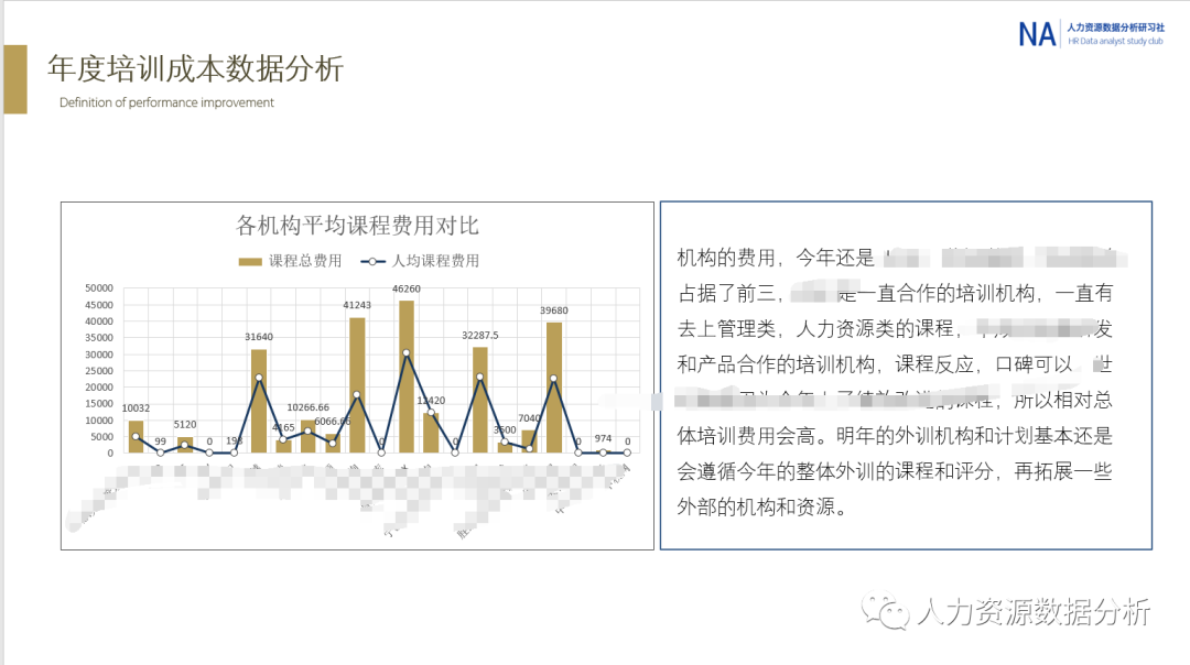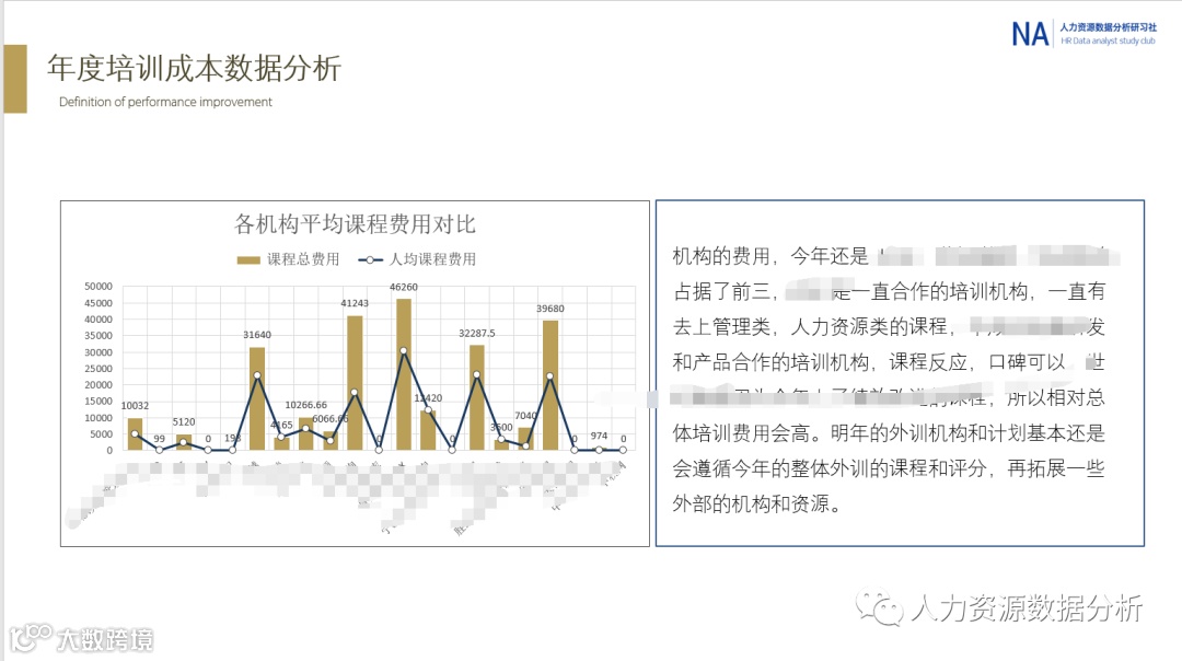 7、另外的维度是分析各个机构的培训费用的维度,我们计算各个机构再19年的所有的培训成本,我们结合课程费用和人均课程费用,来分析每个机构的人均费用,再结合课程的评估,最终再2020年选择性价比最好的机构。