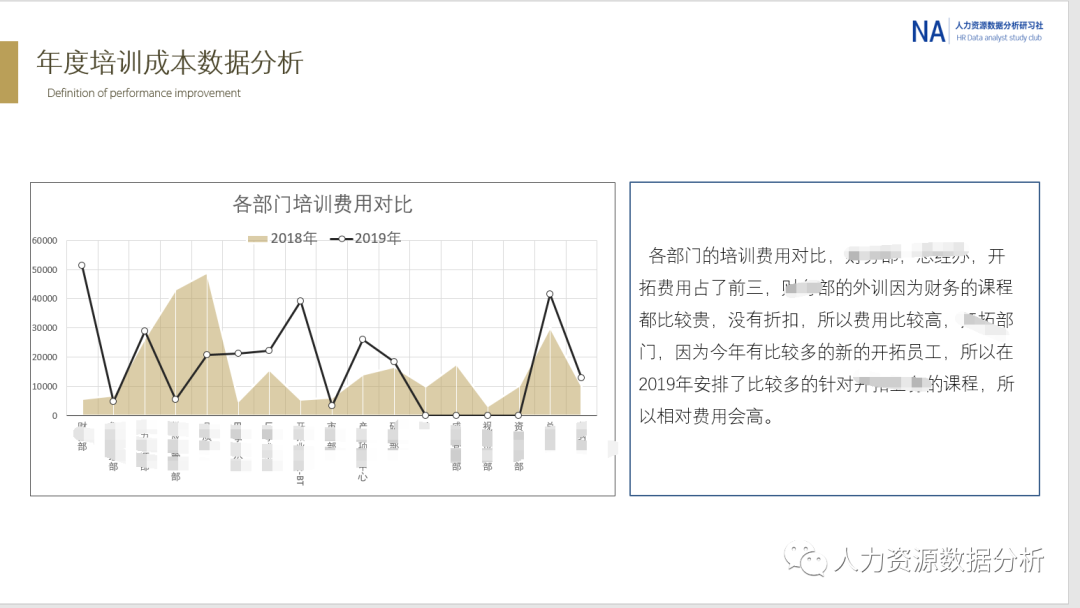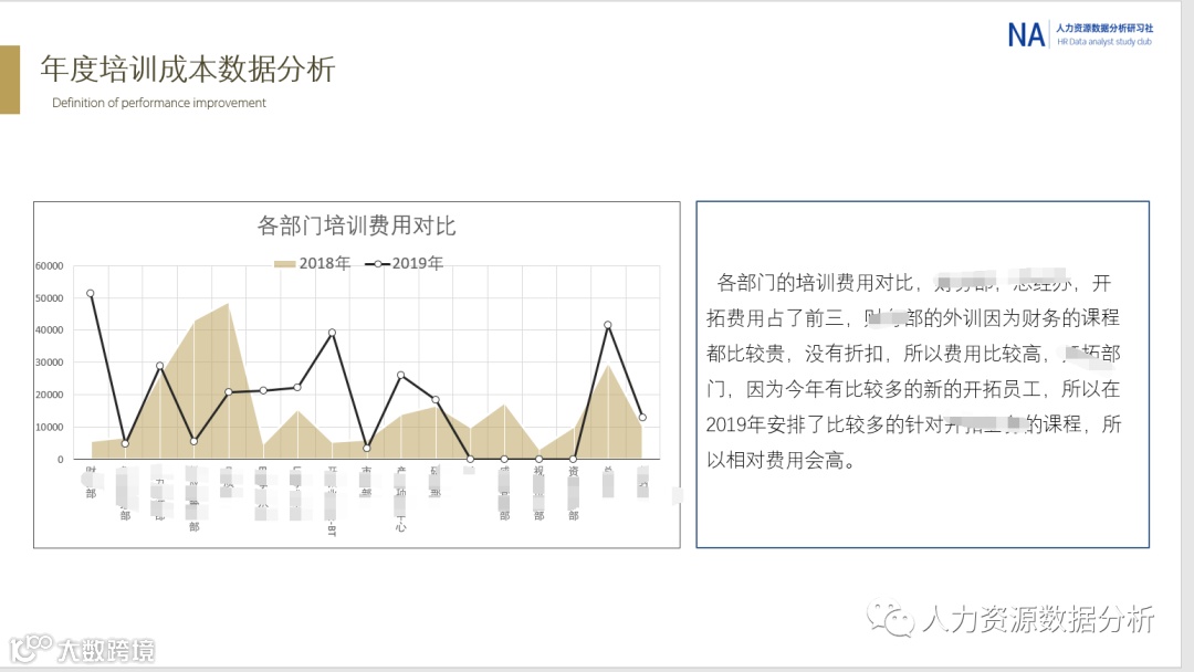 4、对人均可是进行对比分析,找出19年人均可是和18年差距最大的几个部门,然后根据19年的公司的实际培训的情况进行分析,为什么差距大,原因是什么,大家可以看我右侧的可是数据分析描述。