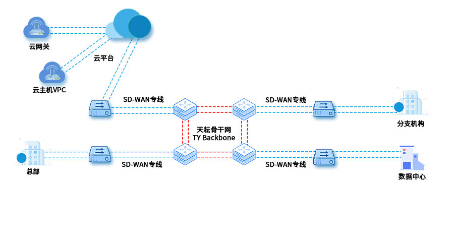天耘SD-WAN专线为企业提供高效的多地组网及智能管理服务,帮助用户零部署接入天耘骨干网(TY Backbone),实现低成本、高品质的 连接云端、数据中心、企业分支之间的专属网络。