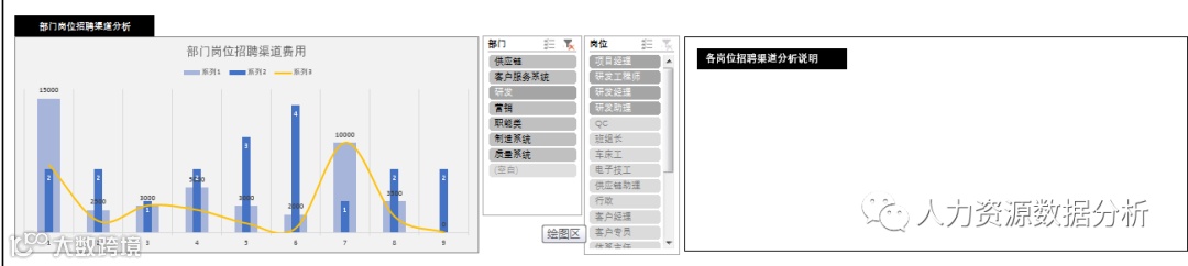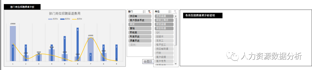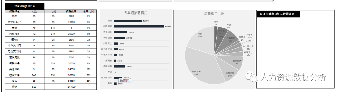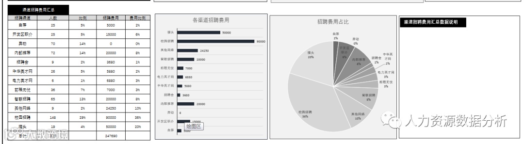 我们需要知道各个渠道招聘到的人数,人均招聘费用,总的招聘费用,费用占比,这个数据是为了我们明天做投放岗位需求的时候做一个数据的参考