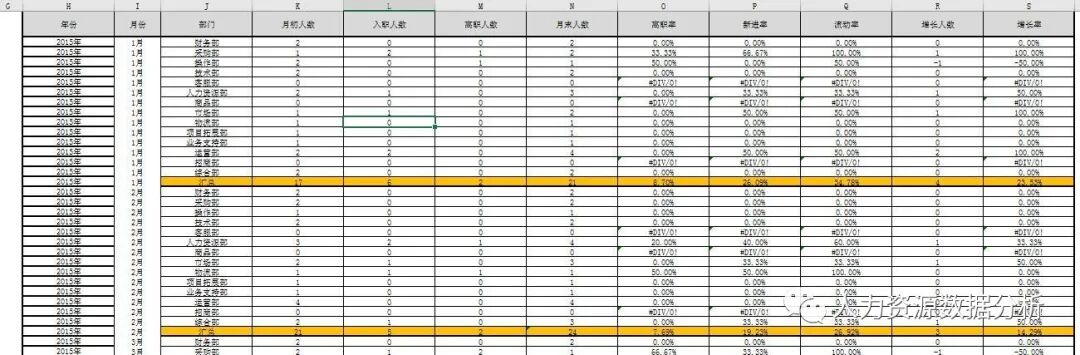 1、每个部门的每月的人员流动数据,离职率,入离职人数,流动率