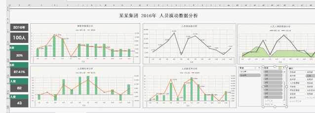 接下来我们需要做数据仪表盘,把我们数据透视生产的图表,制作成数据仪表盘。通过数据的交叉和筛选我们仅仅用一张仪表盘,就可以看到关于人员流动的你任何想看的数据图表。