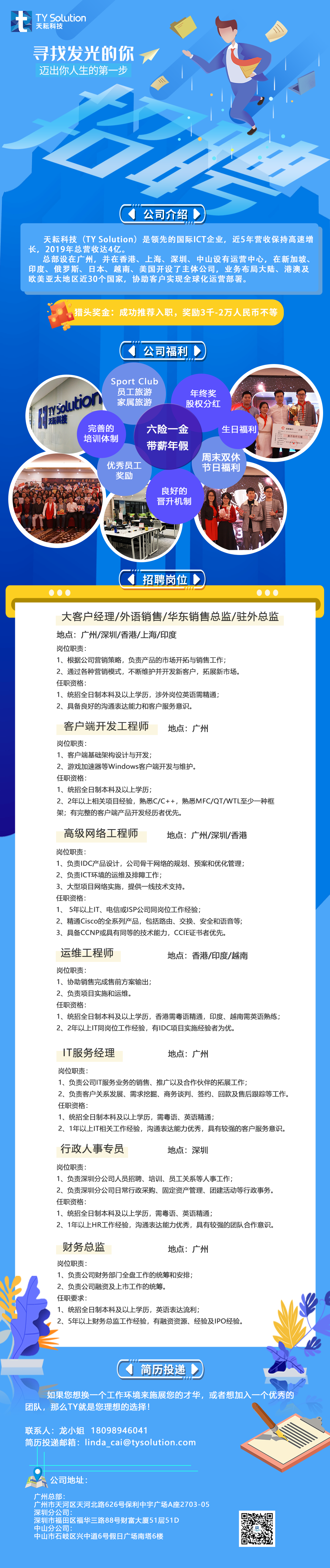 导读:天耘科技2020企业招聘,只等你来!马上加入我们!简历投递邮箱:linda_cai@tysolution