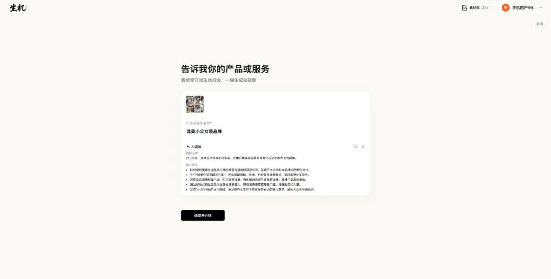 点击【确定并开始】,生机 Agent 将基于你选择的「生意机会」与偏好,自动生成短视频创意脚本,并以故事序列(Storyboard)的方式呈现每个分镜的逻辑、画面和口播。
