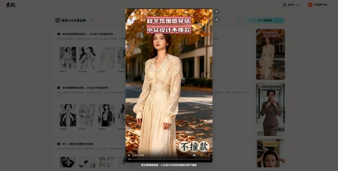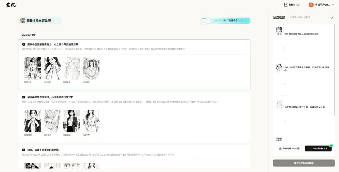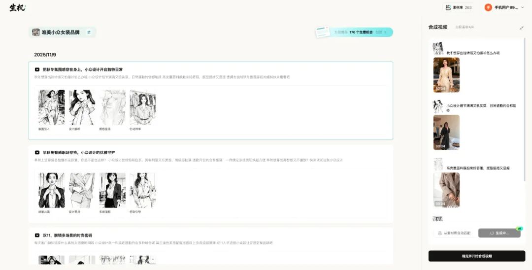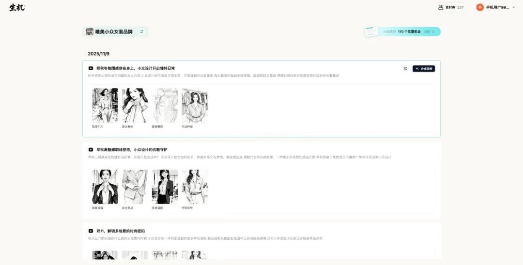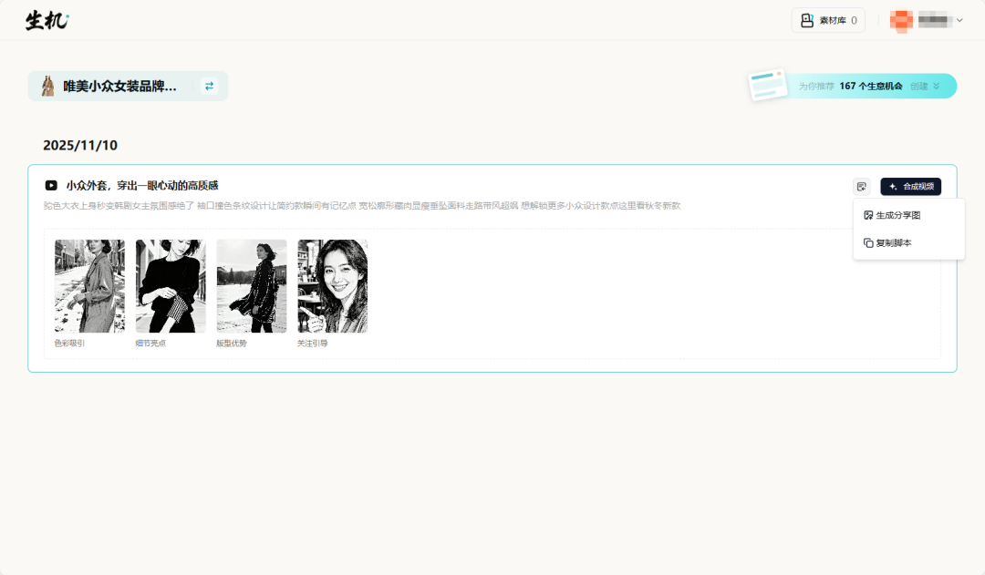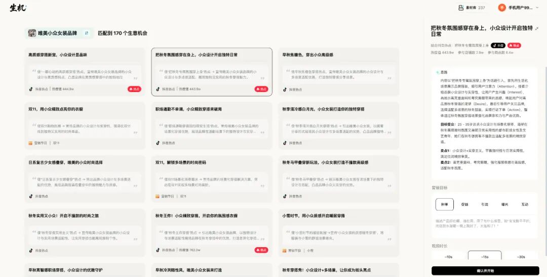 生机 Agent已为你匹配到多个「生意机会」后,你只需选择最契合你的选题,后续从创意到脚本都由AI完成。