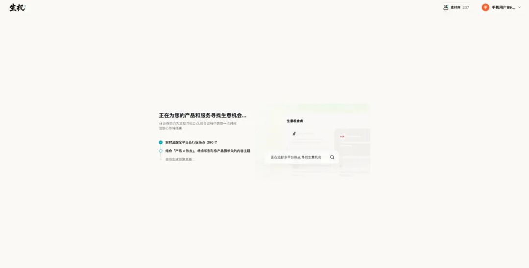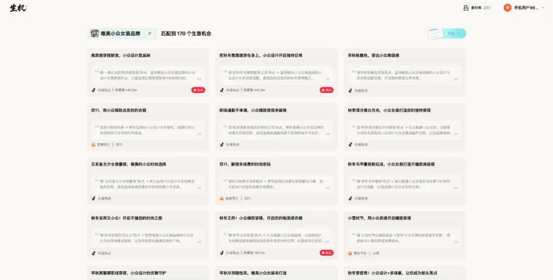 点击【确定并开始】,生机Agent将实时追踪平台 / 节日 / 行业热点,自动生成「生意机会卡片」。