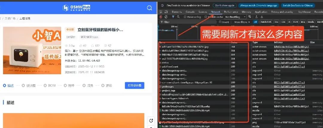 在开源广场随意打开一个工程,按 键盘的F12打开调试信息,再刷新一下页面,然后选择 Network信息,如: