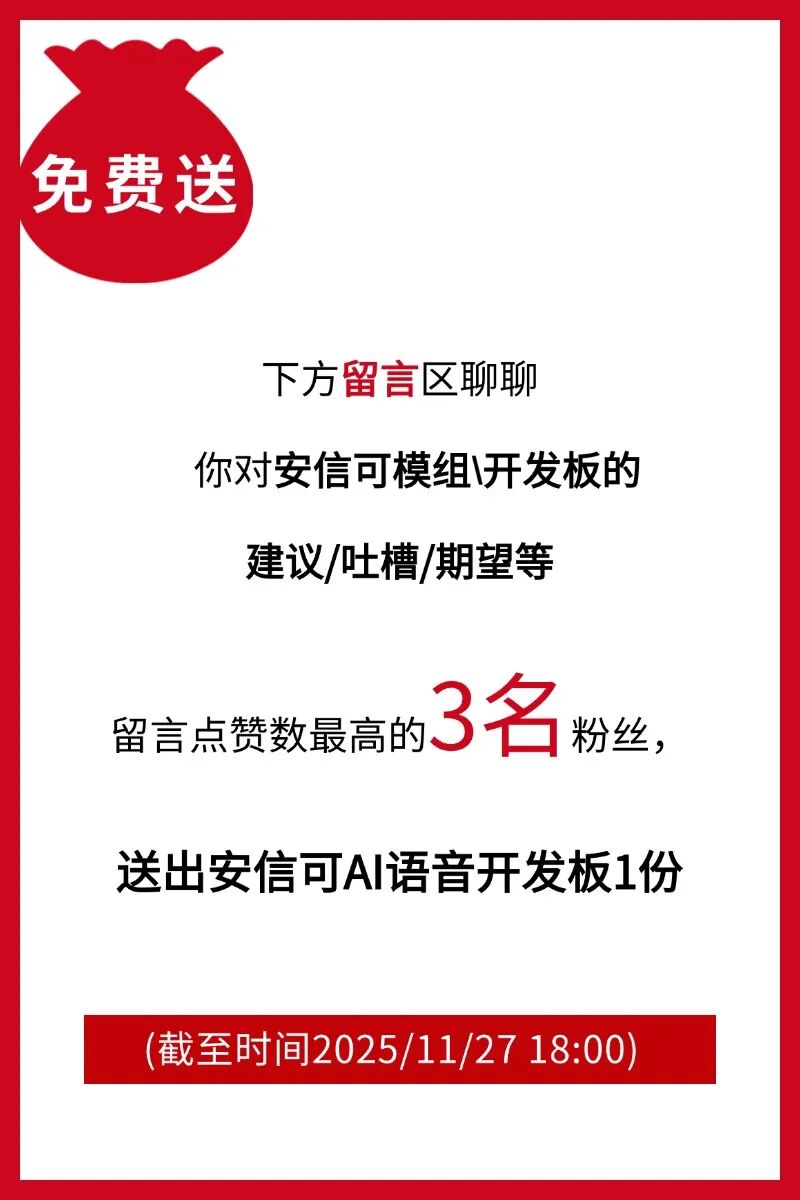 安信可 AI 语音模组Ai-WV01-32S ,让通义千问、DeepSeek、豆包的强大能力通过自然语音交互,将AI能力带入各行各业。