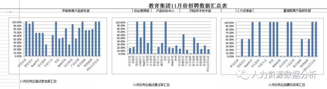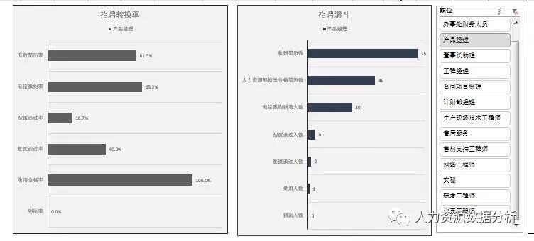 在数据的图表分析上,主要分析了3个指标 岗位面试参加了,岗位面试通过率,岗位招聘完成率 ,后面两个指标是招聘的关键指标,前面的岗位面试参加了只是招聘过程中的一个指标,这个时候其实是要根据岗位来对招聘过程中的各个阶段的关键指标进行分析,运用漏斗图和数据透视,数据交互的设计来进行各个岗位招聘关键指标的分析,修改如下