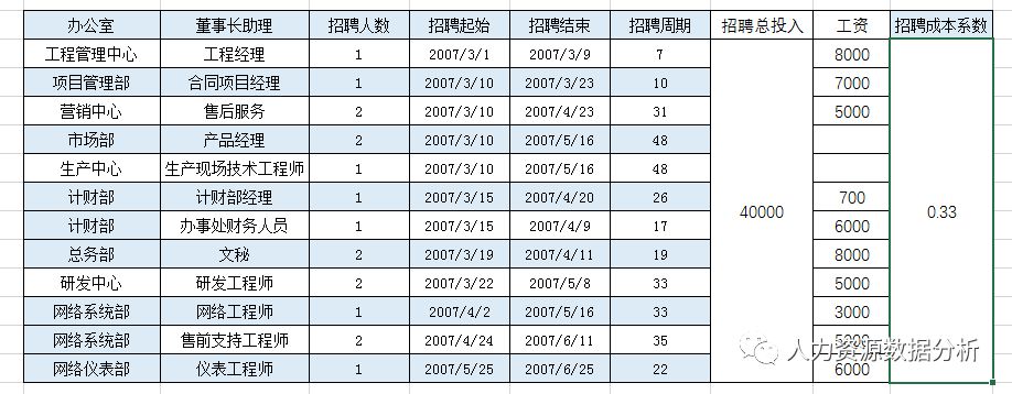 什么是招聘成本系数呢,我来举个例子,加入我去招聘会,招到了两个岗位,一个是前台,一个是总监,前天工资4000.总监工资10000.招聘会我花了3000,那这个招聘会的招聘系数是多少呢?
