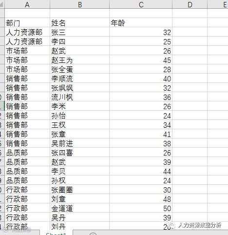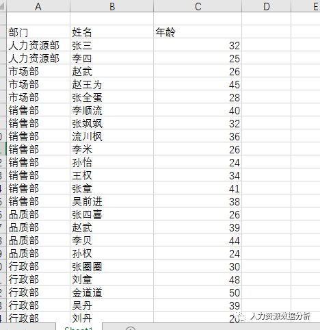 这个是我们见到的最常见的人力资源人员机构中的年龄段的数据,如果这个时候我想知道20-30岁的人,总共多少人,占了多少比例,相对人员数据少的话还好统计,如果人员数据多的情况下,我们一般会用数据透视表,然后选取部门和年龄的数据,然后再对年龄数据进行分组,在数据透视表里进行数据的呈现,这种方法相对来说有点复杂。