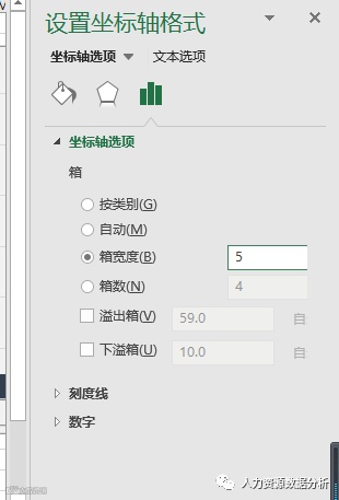 在这个图表里,大家看到系统默认的年龄段的范围是9.9岁,也就是意味着9.9岁取一组数据,那这个是可以自己设置的,我们想以5岁为一组,我们可以这么改:
