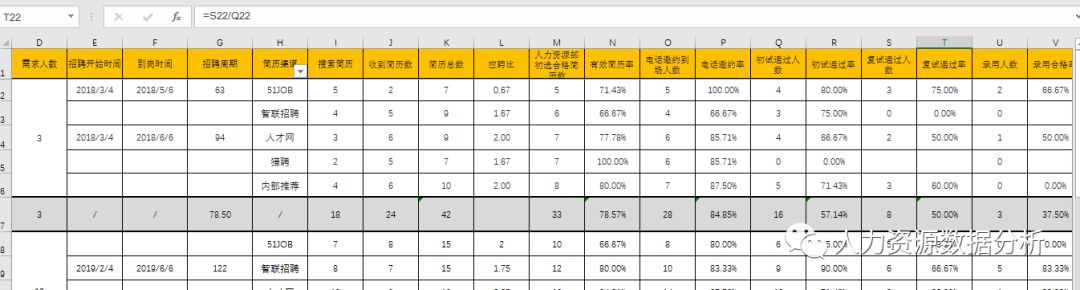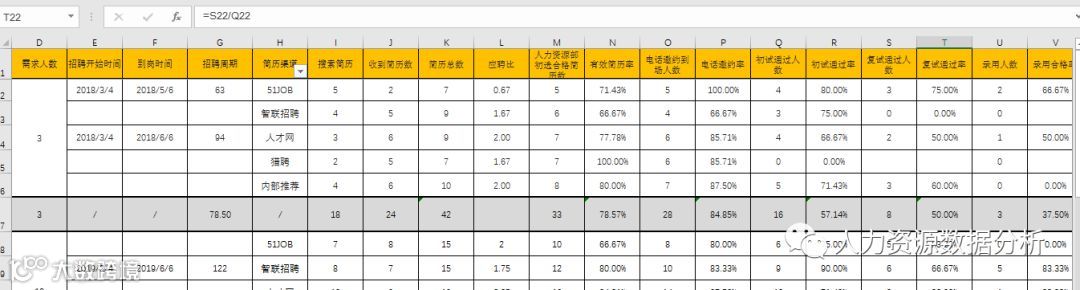 这是一个招聘效能数据的分析,相对来说这算是一个比较简洁的数据报表,而且我相信很多HR 都习惯这样的记录数据,但是这个数据报表在对我们做招聘效率分析的时候可能会有点作用,因为我们要记录招聘每个阶段的数据,但是当我们年底要去分析,我们一个岗位招了5个人,这5个人来自哪些渠道,其他渠道有人投简历吗? 在哪一个环节被淘汰了,为什么淘汰,平均一个岗位的招聘周期是多久,每个渠道的年度总费用多少,岗位的平均费用是多少,哪个岗位的性价比最高,这些问题不单单是人力资源要知道的问题,也是当你面对业务的时候需要回答的问题,如果你要回答我这么多问题,那你的原始数据的记录就不应该是这样的了。