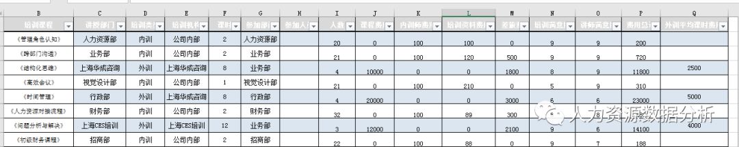 各个部门的外训的培训费用和满意度,我们在分析培训成本的时候,因为现在很多公司培训的成本会分摊到各个部门去,所以我们在计算成本的时候是以部门为单位的,我们会去看每个部门每年支出了多少的培训费用,所以这个时候我们会横向的去对比各个部门的培训费用,当然如果再细分的话,我们会去看一年里每个部门都去上了哪些课程,总计费用多少,参加多少人,这个课程平均费用多少,这个课程的满意度是多多少,从这个方面去判断,明年还是否需要去采购这个课程。所以通过这些分析,我们可以把一些费用高的,满意度低的课程砍去,使培训整正的具有性价比。
