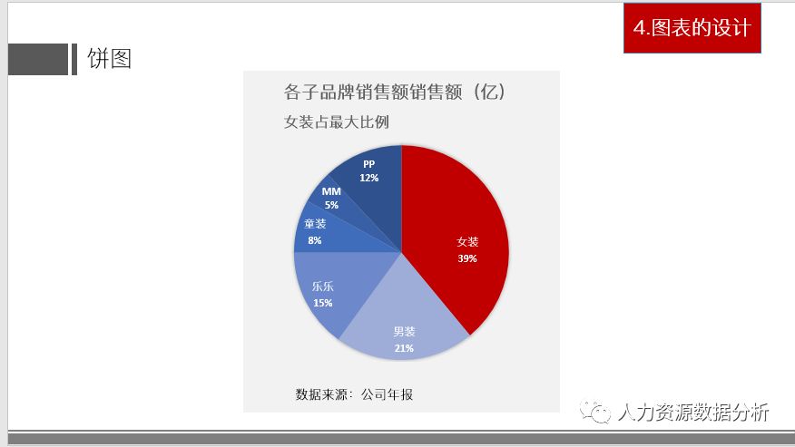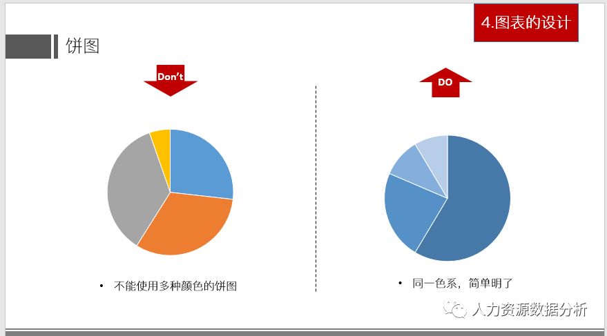 2.饼图用同一个色系的颜色来代表各个切片,千万不要用一些不同的颜色来填充,在视觉上相同色系的切片更容易让人接受,但是如果你要让人看你想要突出的内容,你可以把那个切片变色,或者突出。