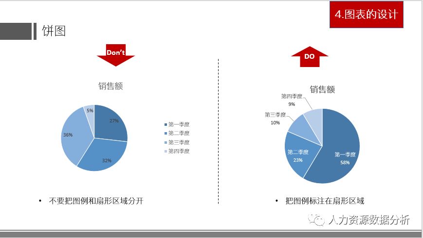 3. 千万不要把图示和饼图分开,比如第一图,你要没看完一个图示,再去看切片,在视觉上就非常的不舒服,正确的呈现应该是右边的这组。