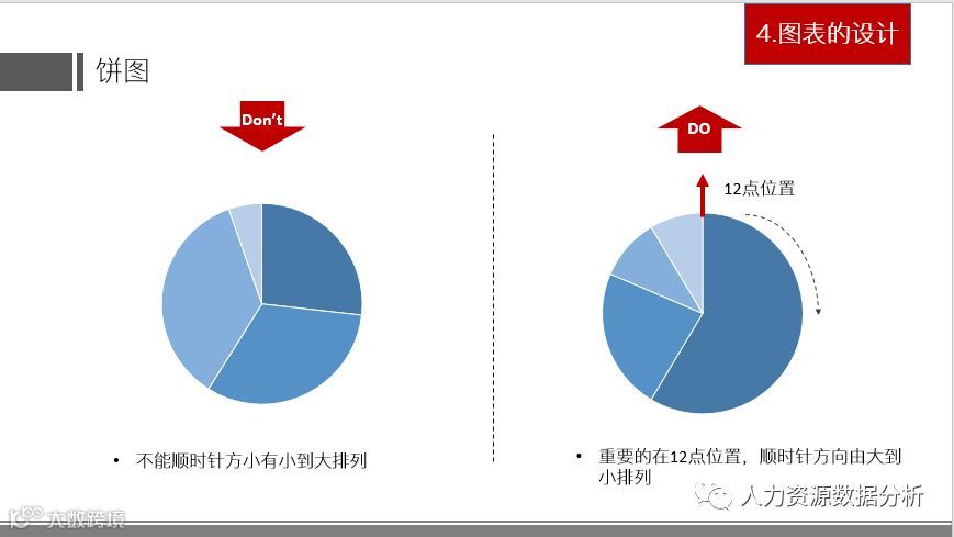 1.饼图的切片的设计,最重要的切片放在12点位置的第一位,这个是因为人的视觉一般都是顺势正的方向,而且当我们看饼图的时候,第一眼看到的是12点的方向,所以我们在做切片的排序的时候,一般会把最重要的切片,放在第一眼能看到的地方。