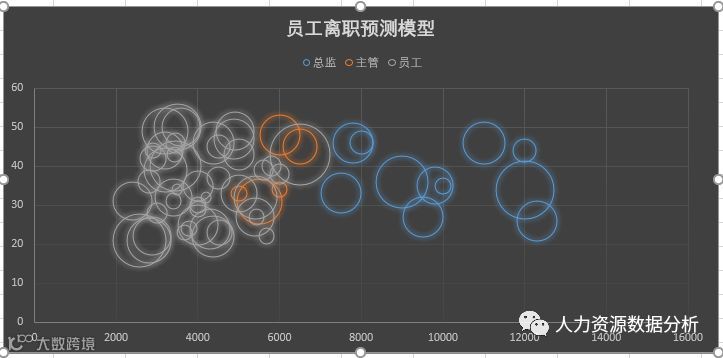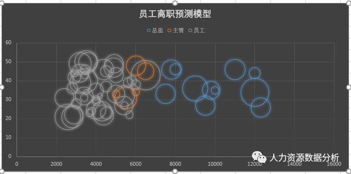 在这个模型里,不同的颜色代表不同的级别,X轴代表薪资,Y轴代表年龄,气泡的大小代表工龄,这样我们可以根据数据的集中程度,来分析XY轴的数据,最后得出每个阶段的离职人员的数据,为人员离职做预测。