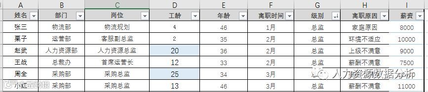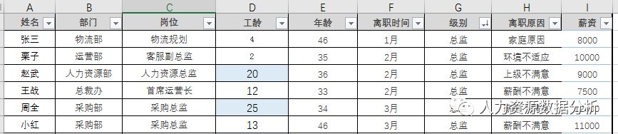 首先在建立模型之前我们需要完成最基础的原始数据的收集和表格的设计,这些工作应该是HR在每个月需要完成的,因为进行数据预测模型,我们需要有大量的数据,也就是说数据越多,整个预测越精准,所以在进行这个模型建立之初我们首先要有一个原始的人员离职的数据表格,如下