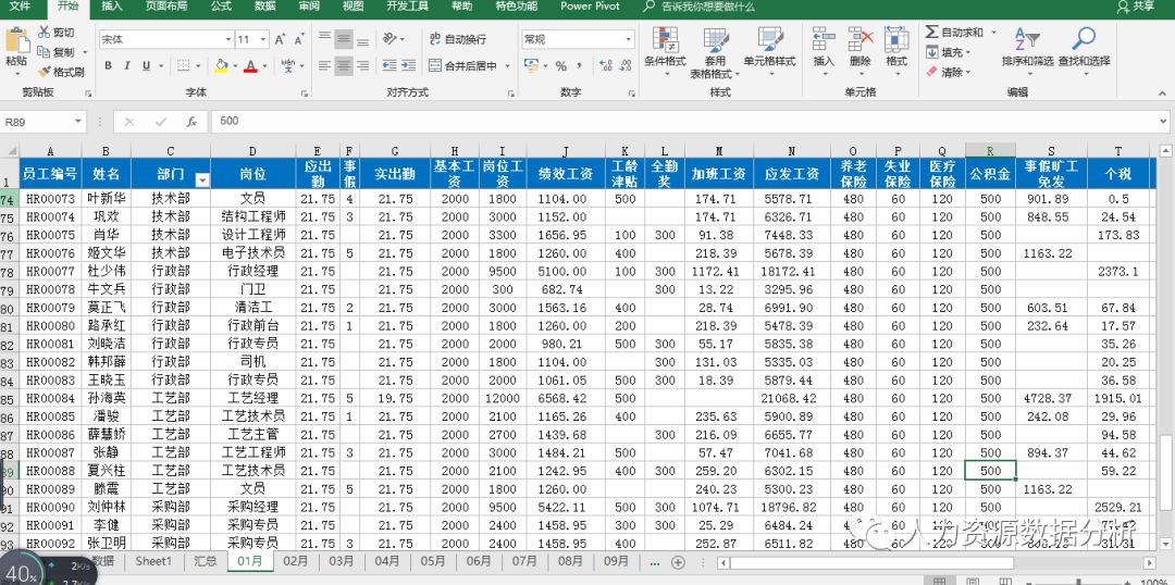 我们在做年度薪酬数据分析的时候需要对一年内每个月的薪酬数据进行分析,在进行数据分析的前提工作我们需要对每个月的薪酬数据进行汇总,我们每个月的薪酬数据表格可能是这样的