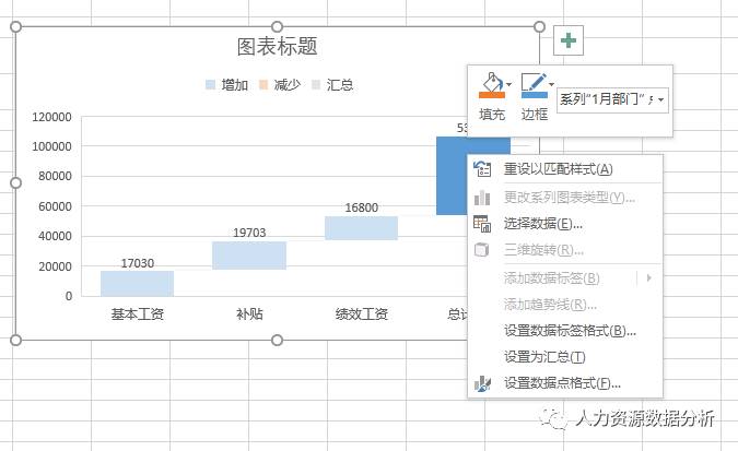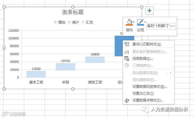 点击总计工资的数据条,然后点击设置为汇总,这个时候就会变成标准的工资结构的瀑布图。