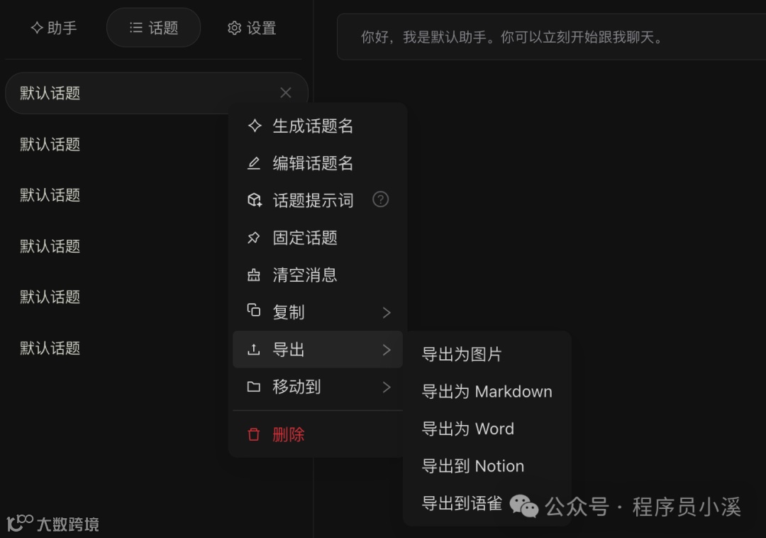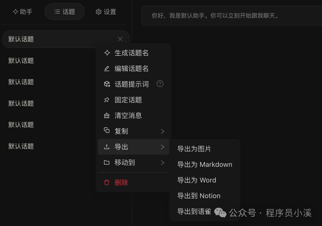 Cherry Studio对话题提供了多种操作,除了常规生成、编辑等操作,还提供了导出功能,可以一键将会话内容导出到 图片、Markdown、Word、Notion 和 语雀。