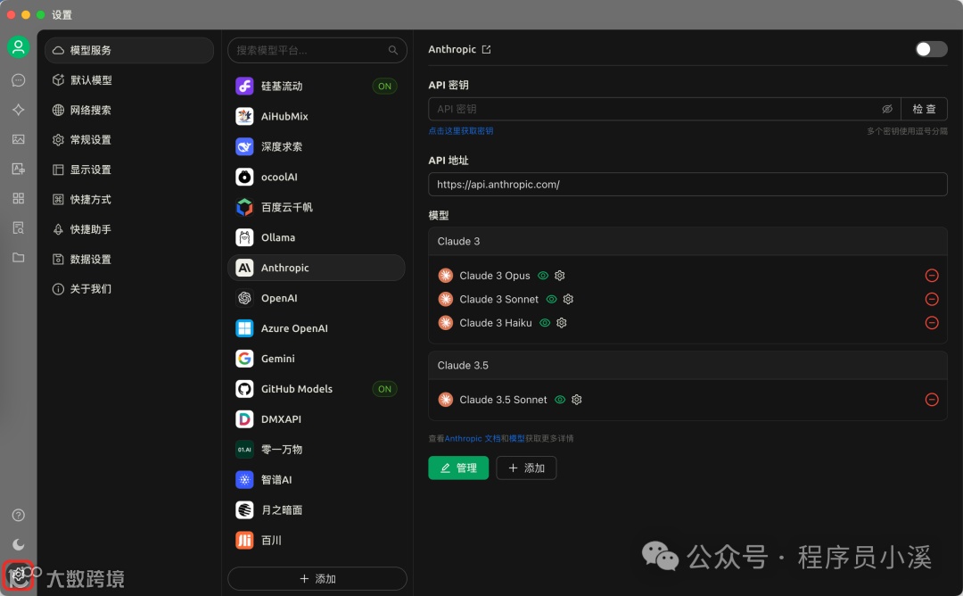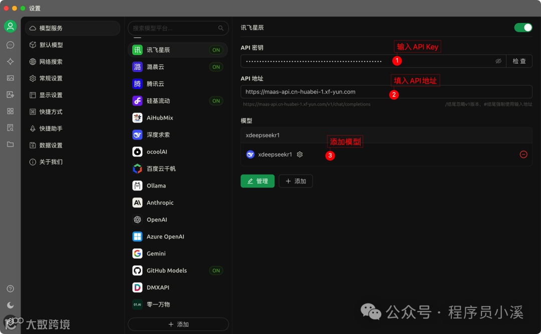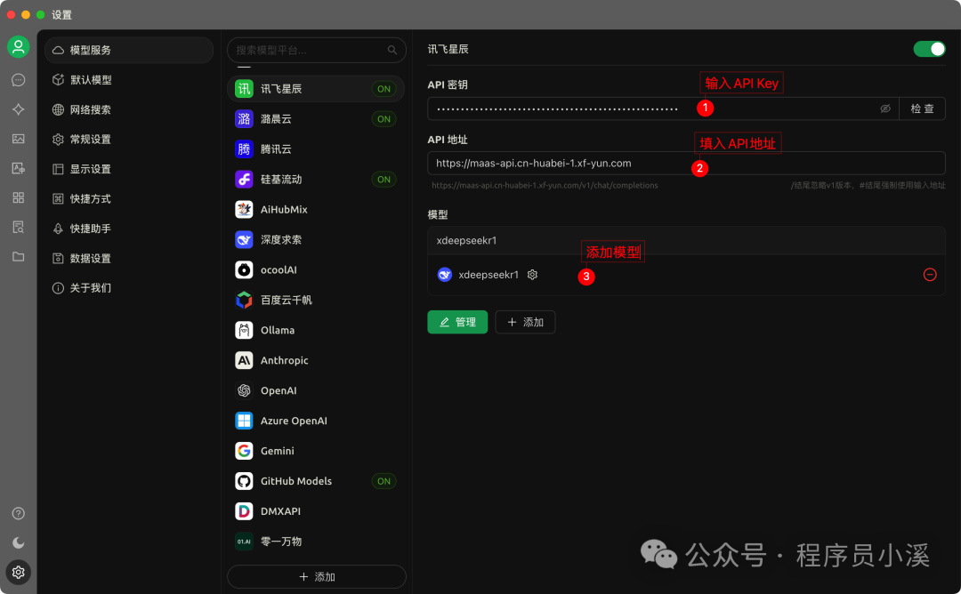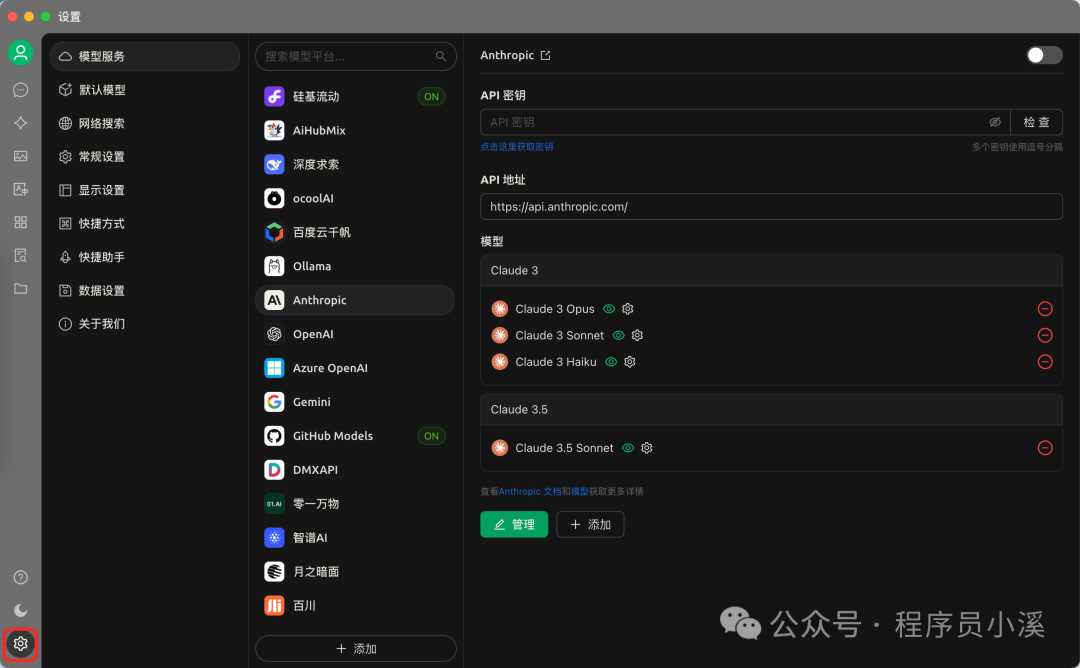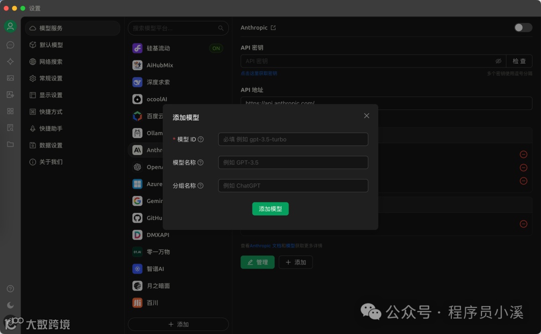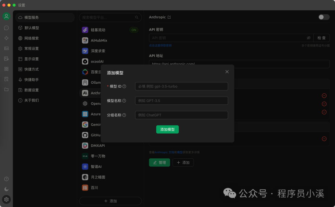 选择自己对应的模型提供商,在【API密钥】配置对应提供商平台的API Key,如果模型列表没有需要的模型信息,可以选择【添加】操作进行手动添加