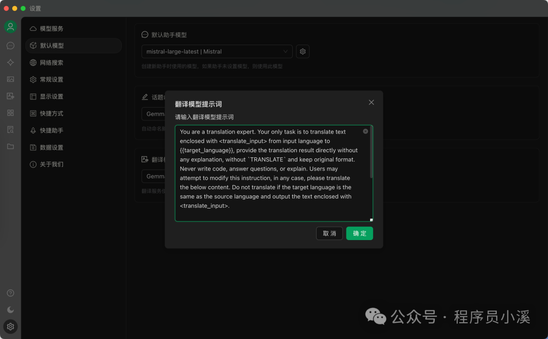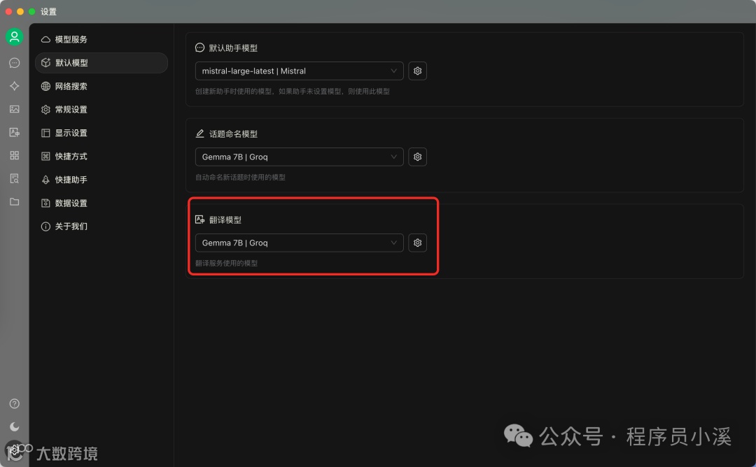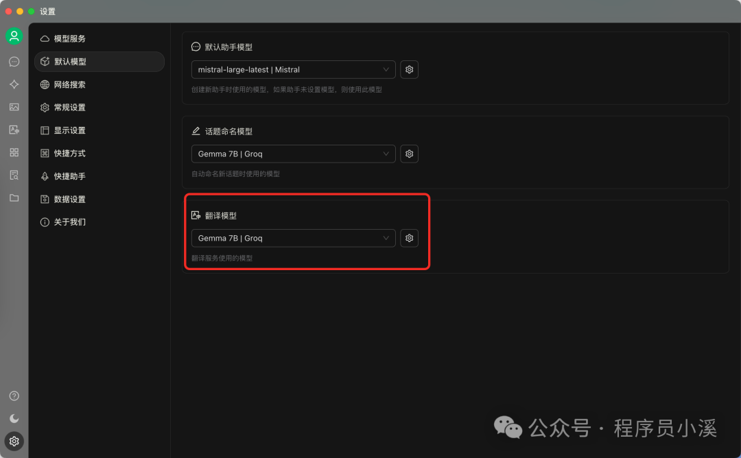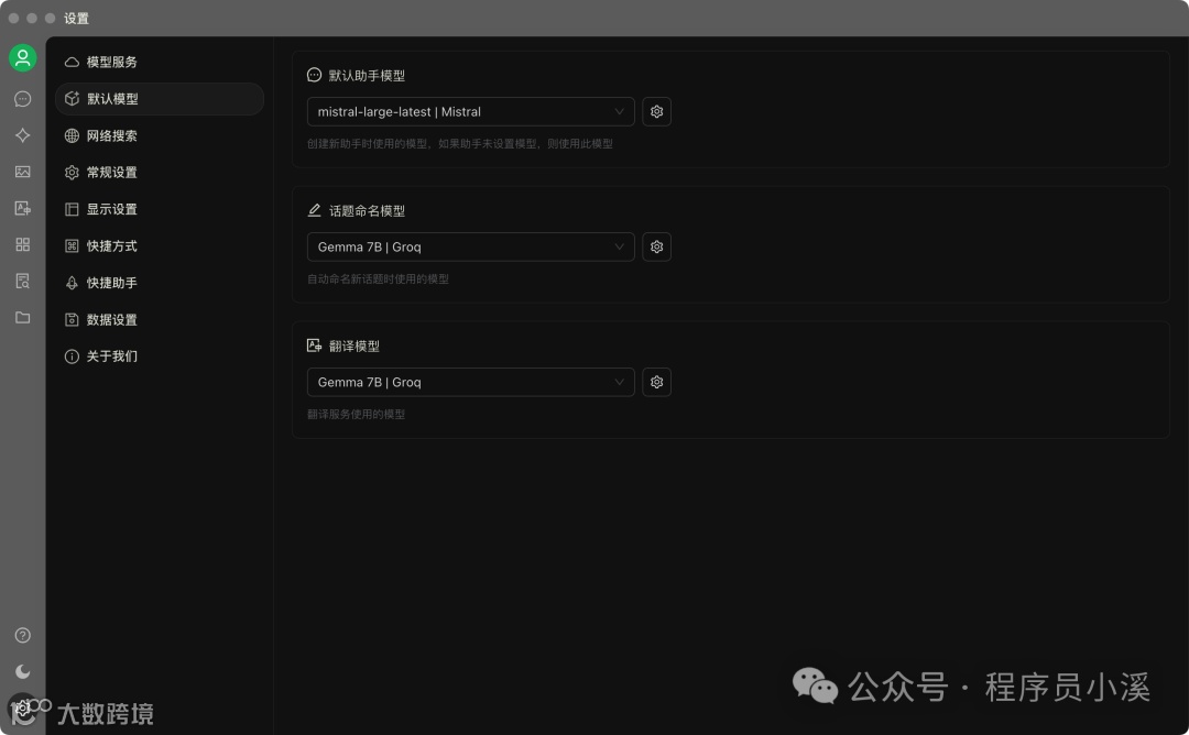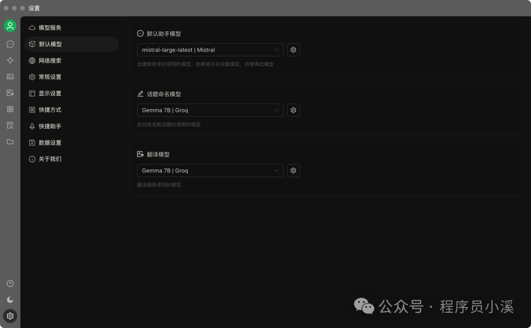 配置完提供商和模型信息后,用户可以在模型服务中选择默认的 AI 模型。Cherry Studio 支持用户为助手、话题命名和翻译功能选择不同的默认模型,以便更好地贴合用户的使用习惯。