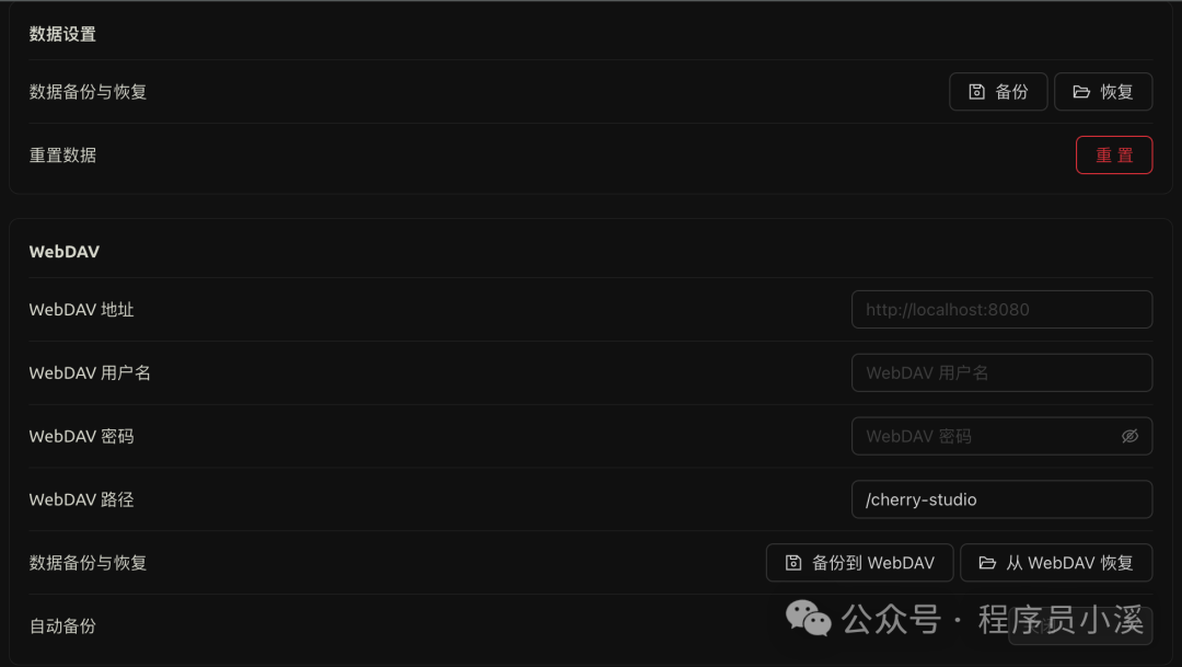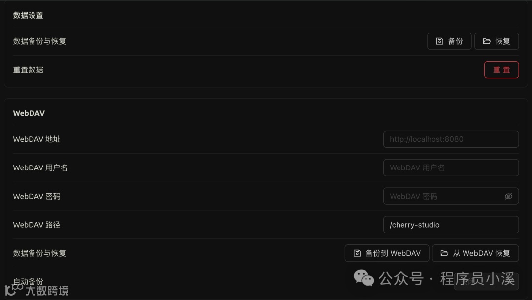 Cherry Studio使用的数据都存储在本地,不用担心隐私泄露问题。Cherry Studio同意提供了备份方案,可以自行将数据备份到 WebDAV、Notion、语雀