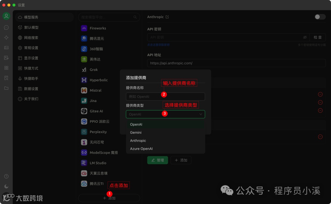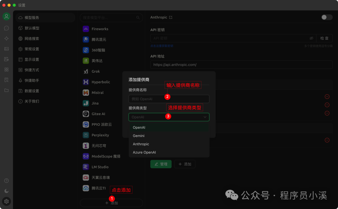 如果在模型提供商列表没有你需要的提供商,可以点击提供商列表底部【+添加】提供商