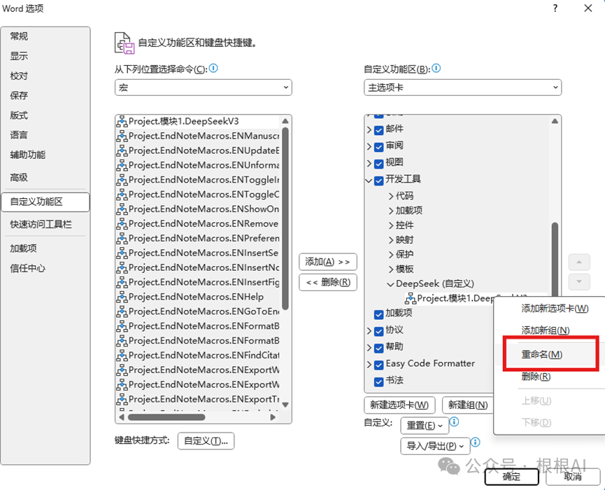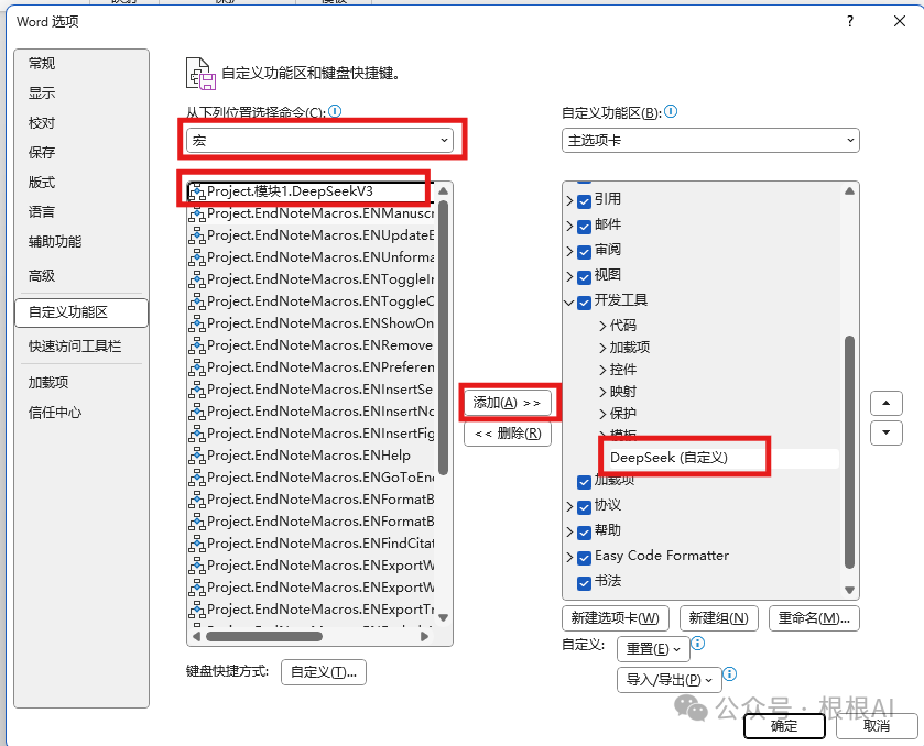 首先选择DeepSeek(自定义),选择左侧的命令为“宏”,找到我们添加的DeepSeekV3,选中后点击添加。
