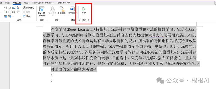 按照文本教程完成操作后,Word的选项卡中将会出现DeepSeek的生成图标,选中文本并点击生成,即可实现模型回复!例如,我们想要将一段中文文本翻译成英文: