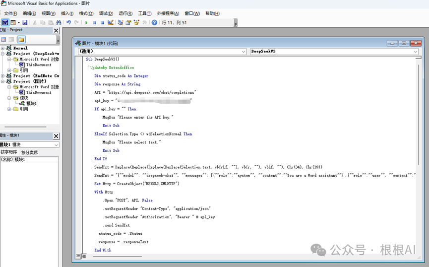 Function CallDeepSeekAPI(api_key As String, inputText As String) As StringDim API As StringDim SendTxt As StringDim Http As ObjectDim status_code As IntegerDim response As StringAPI = "https://api.deepseek.com/chat/completions"SendTxt = "{""model"": ""deepseek-chat"", ""messages"": [{""role"":""system"", ""content"":""You are a Word assistant""}, {""role"":""user"", ""content"":""" & inputText & """}], ""stream"": false}"Set Http = CreateObject("MSXML2.XMLHTTP")With Http.Open "POST", API, False.setRequestHeader "Content-Type", "application/json".setRequestHeader "Authorization", "Bearer " & api_key.send SendTxtstatus_code = .Statusresponse = .responseTextEnd With' 弹出窗口显示 API 响应(调试用)' MsgBox "API Response: " & response, vbInformation, "Debug Info"If status_code = 200 ThenCallDeepSeekAPI = responseElseCallDeepSeekAPI = "Error: " & status_code & " - " & responseEnd IfSet Http = NothingEnd FunctionSub DeepSeekV3()Dim api_key As StringDim inputText As StringDim response As StringDim regex As ObjectDim matches As ObjectDim originalSelection As Objectapi_key = "替换为你的api key"If api_key = "" ThenMsgBox "Please enter the API key."Exit SubElseIf Selection.Type <> wdSelectionNormal ThenMsgBox "Please select text."Exit SubEnd If' 保存原始选中的文本Set originalSelection = Selection.Range.DuplicateinputText = Replace(Replace(Replace(Replace(Replace(Selection.text, "\", "\\"), vbCrLf, ""), vbCr, ""), vbLf, ""), Chr(34), "\""")response = CallDeepSeekAPI(api_key, inputText)If Left(response, 5) <> "Error" ThenSet regex = CreateObject("VBScript.RegExp")With regex.Global = True.MultiLine = True.IgnoreCase = False.Pattern = """content"":""(.*?)"""End WithSet matches = regex.Execute(response)If matches.Count > 0 Thenresponse = matches(0).SubMatches(0)response = Replace(Replace(response, """", Chr(34)), """", Chr(34))' 取消选中原始文本Selection.Collapse Direction:=wdCollapseEnd' 将内容插入到选中文字的下一行Selection.TypeParagraph ' 插入新行Selection.TypeText text:=response' 将光标移回原来选中文本的末尾originalSelection.SelectElseMsgBox "Failed to parse API response.", vbExclamationEnd IfElseMsgBox response, vbCriticalEnd IfEnd Sub