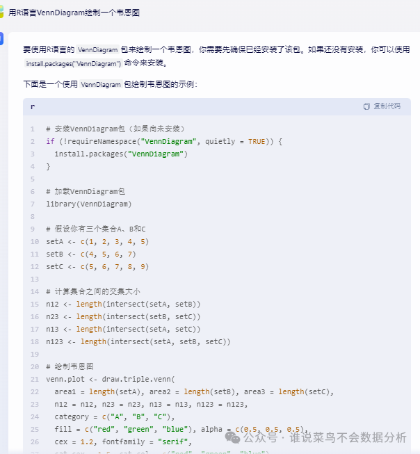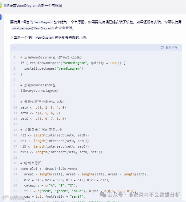 比如,我想绘制一个韦恩图,但只记得R包的名字,不记得具体怎么使用了,这时候可以让AI大模型帮我们给出基础的代码。