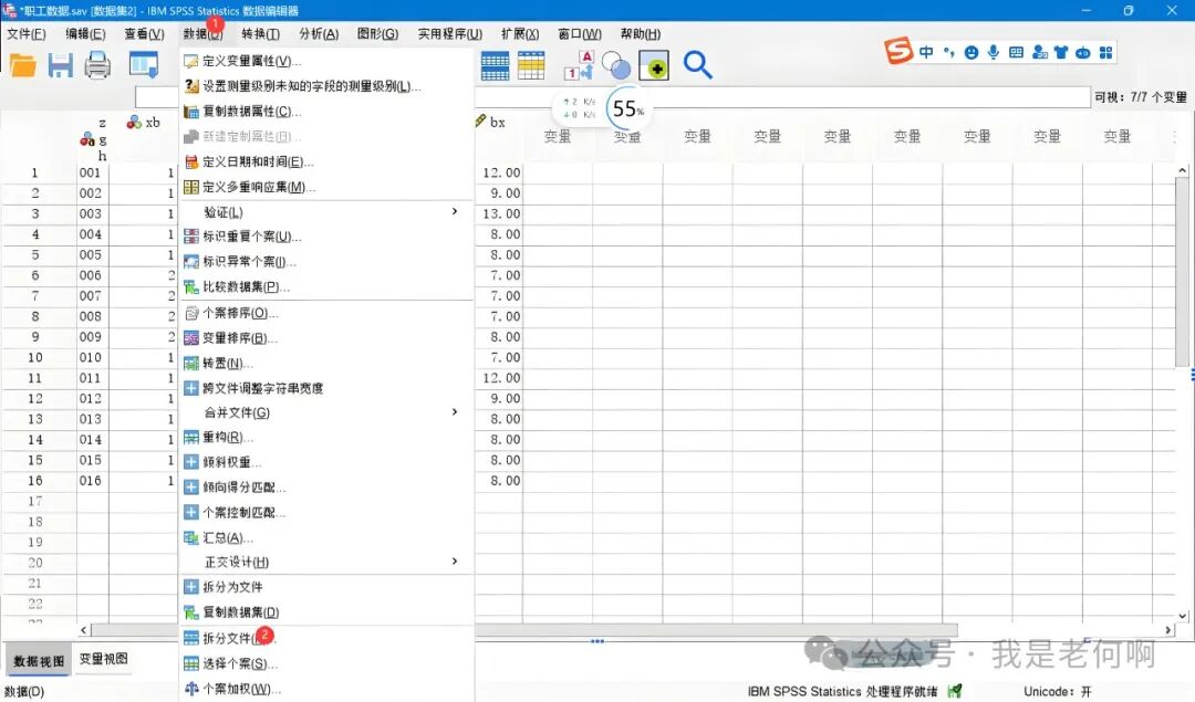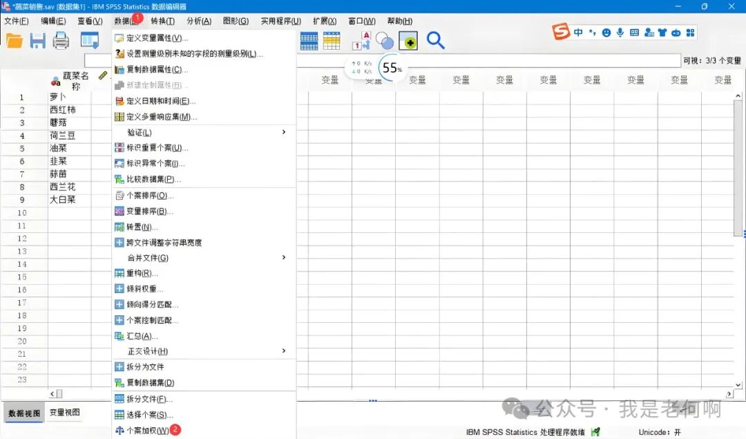 1. 创建权重变量: 你首先需要创建一个包含所有权重值的新变量。这可以在"变量视图"表格中完成,为新变量命名(例如,命名为"weight"),然后在"数值"列中输入权重值。