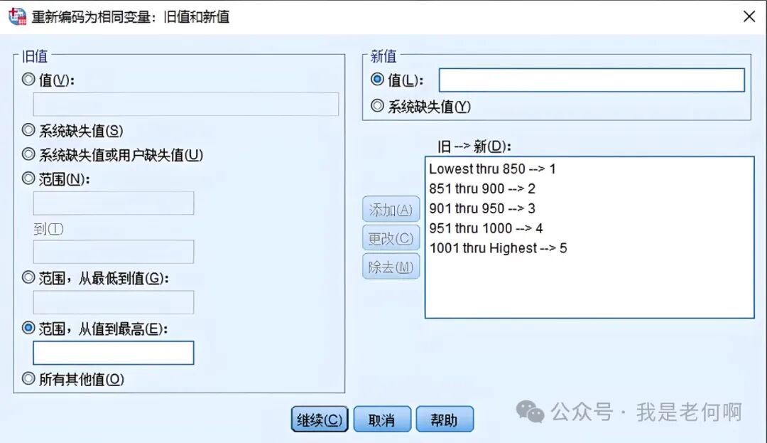 (2)SPSS的组距分组:将全部变量值依次划分为若干个区间,并将同一区间的变量值作为一组。