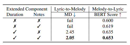 在消融研究中本文报告了针对歌词到旋律和旋律到歌词任务的旋律距离(MD)和BERT分数。