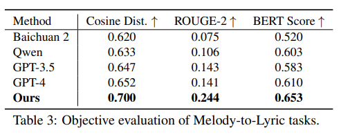 在歌词生成方面,使用CoSENT模型,评估句子级别的对齐。该模型允许输入歌词,并计算生成歌词与原始歌词之间的余弦相似性。此外,结合ROUGE-2分数和BERT分数作为另外两个用于评估歌词生成的度量标准。ROUGE-2分数关注生成文本和原始文本之间的二元组重叠。BERT分数利用BERT-base multilingual uncased 模型基于上下文嵌入来衡量文本相似度。