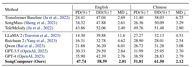 如上表所示,该方法在调性分布相似度(PD)和时长分布相似度(DD)方面优于先进的语言模型,比GPT-4高出10个多点,并在中英双语中实现了最低的旋律距离(MD)。