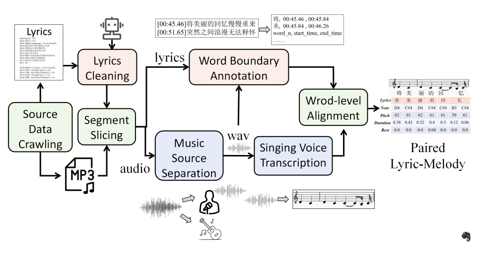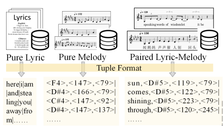 为了进一步丰富配对歌词-旋律数据,本文还抓取网络信息创建了一个包含4,000首经典中文歌曲的数据集。收集歌词-旋律数据的流程如下图所示: